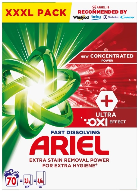 Ariel Ultra Oxi Effect uniwersalny proszek do prania 3,85 kg (70 prań) skutecznie usuwa plamy, zapewnia świeżość ubrań i dokładne czyszczenie tkanin.